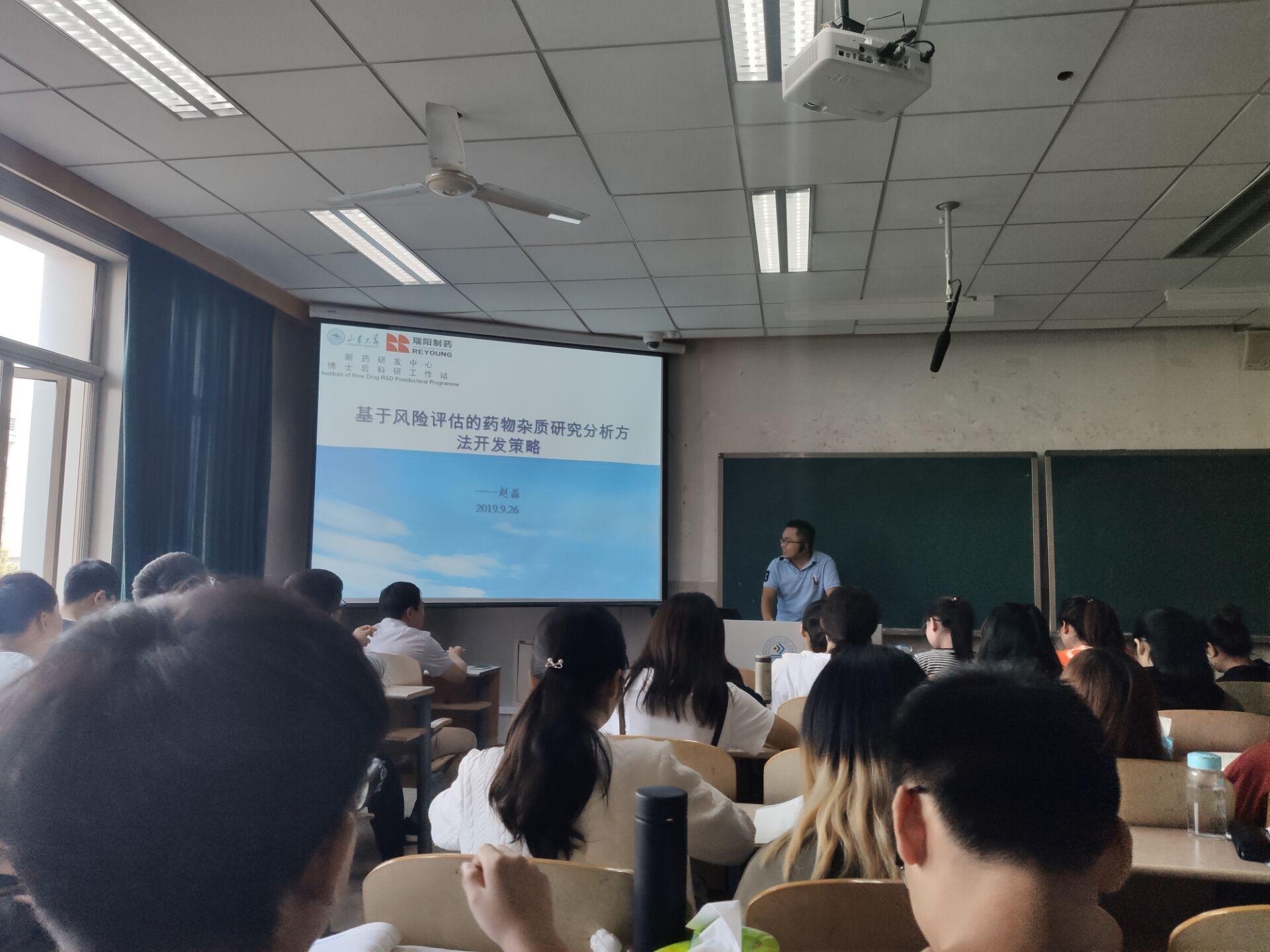 邀请齐鲁制药集团的两位专家在10教410为同学们带来一场关于新药研发注册的专题讲座。讲座向同学们普及了药品研发的基本过程和医药市场的发展现状,帮助同学们尽早进行职业规划。