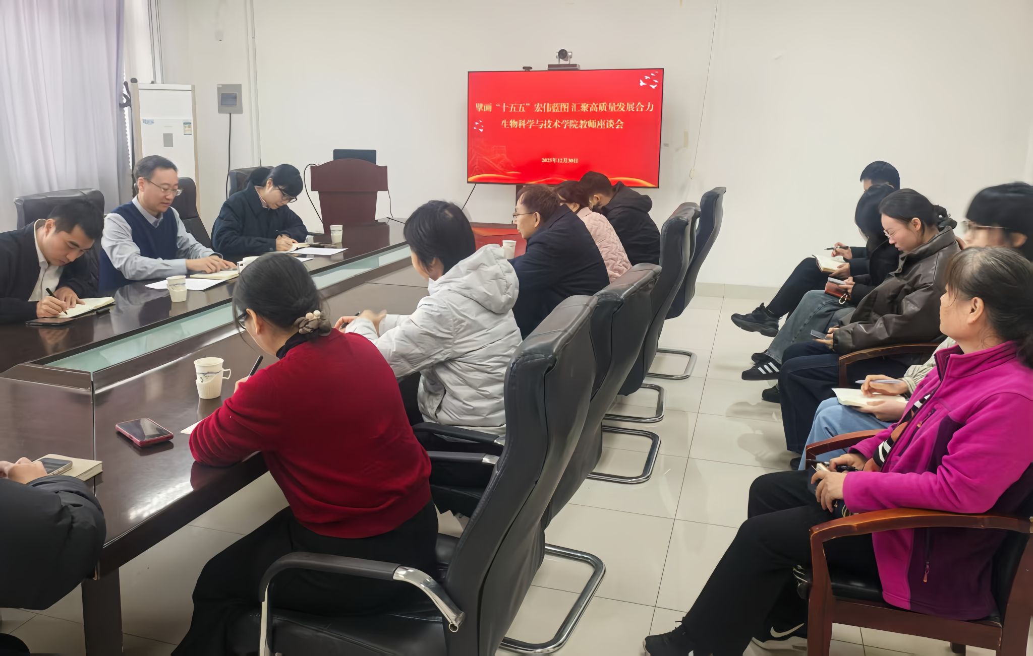 座谈环节气氛热烈,与会教师结合自身工作实际,围绕博士点建设、人才培养、“合成生物学”前沿建设、校企合作多元途径、研究生课程优化、人工智能交叉融合等热点议题踊跃发言,提出了许多富有建设性的意见和建议。大家一致期待学院在“十五五”期间,能搭建起更具活力的科研创新平台与更完善的职业发展支持体系,为教师成长成才提供坚实保障。
