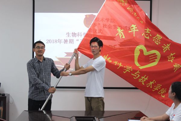 党委书记陈卫东向“三下乡”实践团队授旗,团队成员从陈书记手中接过庄严的旗帜的同时,也担负起了一份沉甸甸的责任,至此,出征仪式圆满结束。