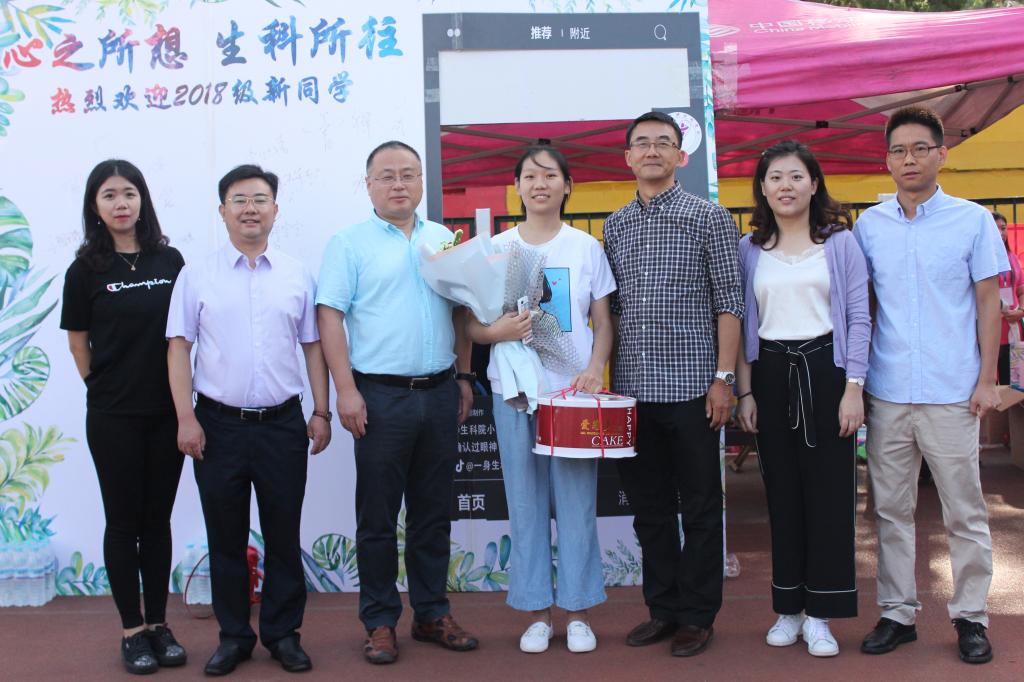 迎新现场视察指导工作,并为报到当天过生日的黎明、杨晶雯两位同学送上鲜花和生日蛋糕,勉励他们珍惜青春好时光,努力学习,勤奋读书,多交朋友。教务处处长、av解说
