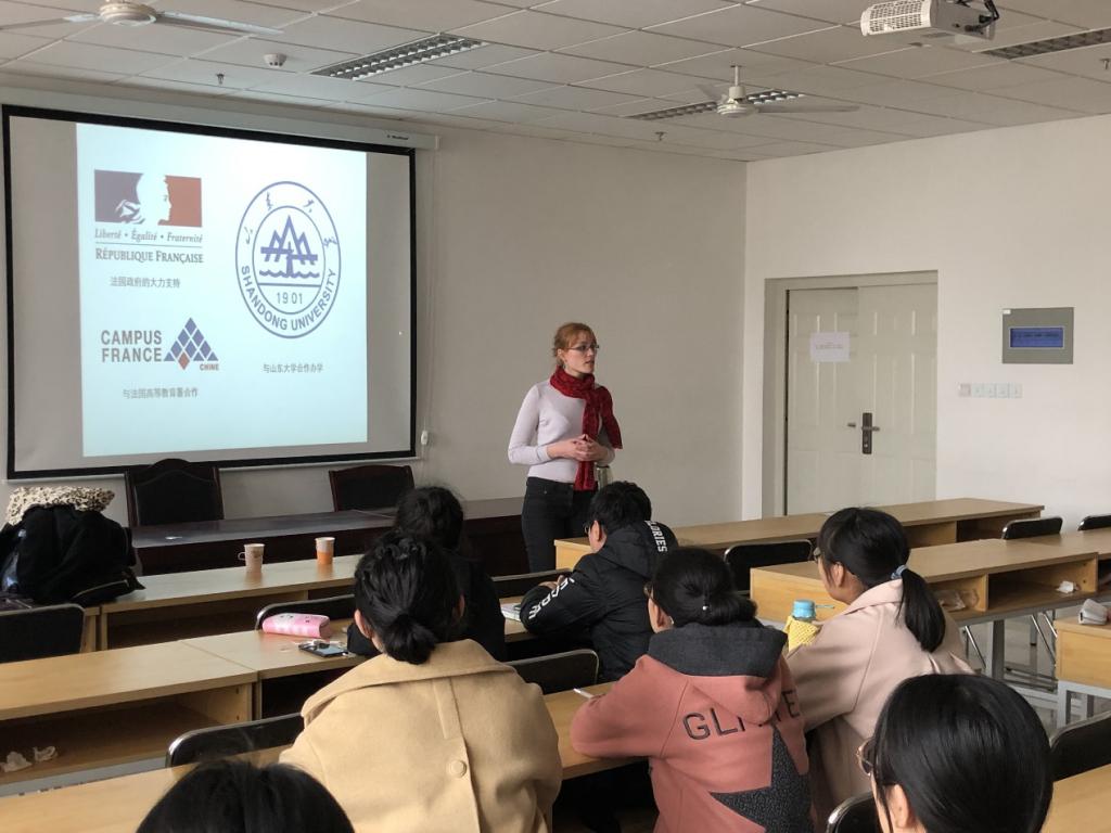 4月10日,法国高等教育署-济南办事处负责人苑姝婧女士、济南法语联盟法方校长MaudMIQUAU女士应邀来av解说举办法国留学宣讲会。