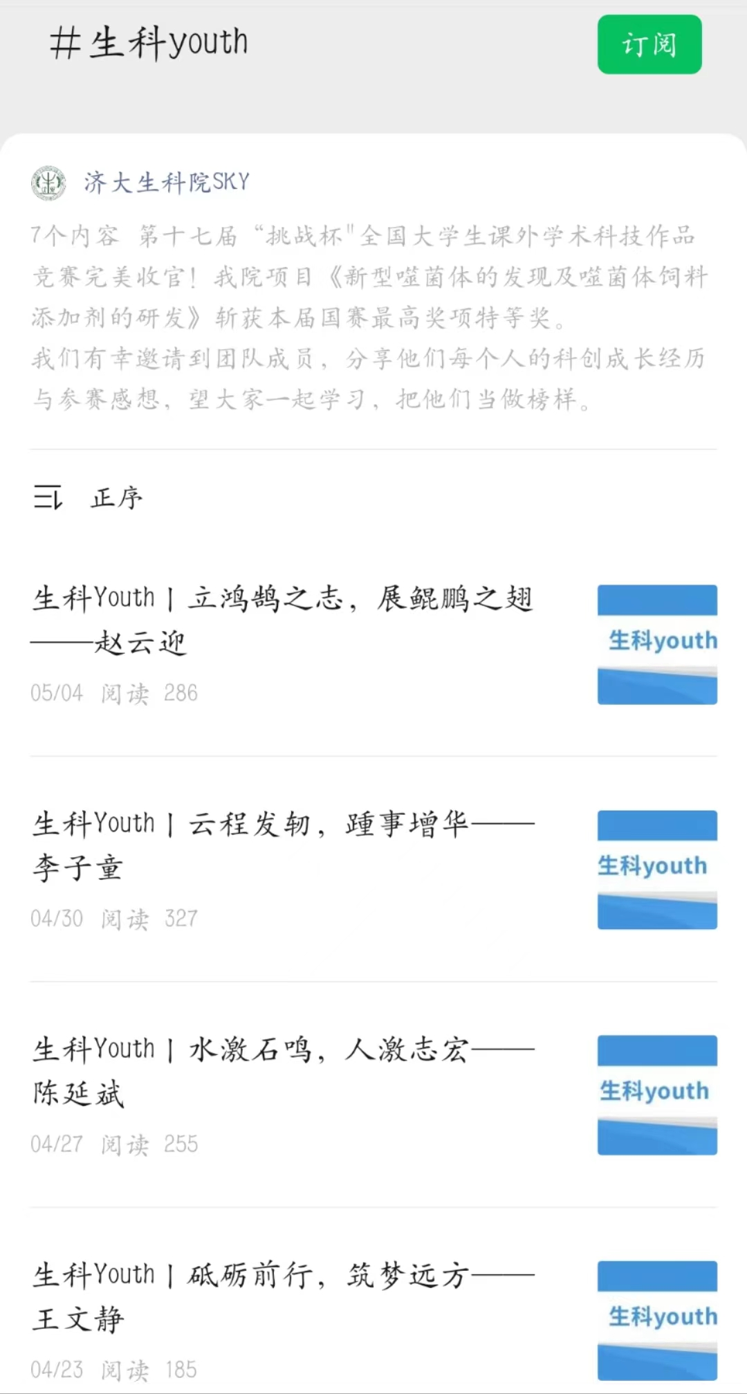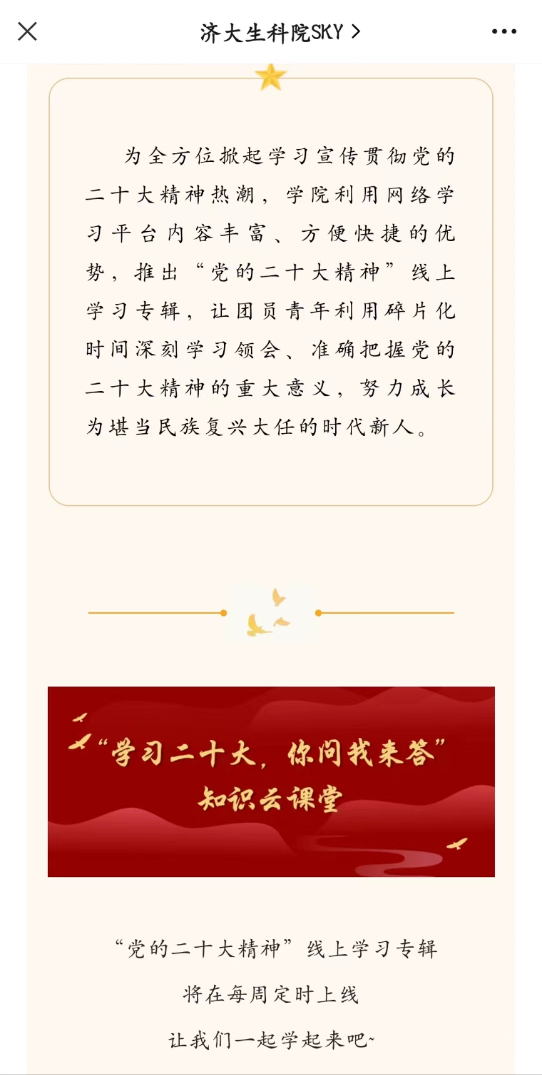公众号推出各类线上课程,在“济大生科院SKY”平台共发布文章197篇,收录并设立十个专辑,内容涵盖思政引领、科学创新、学风建设、志愿公益、av解说