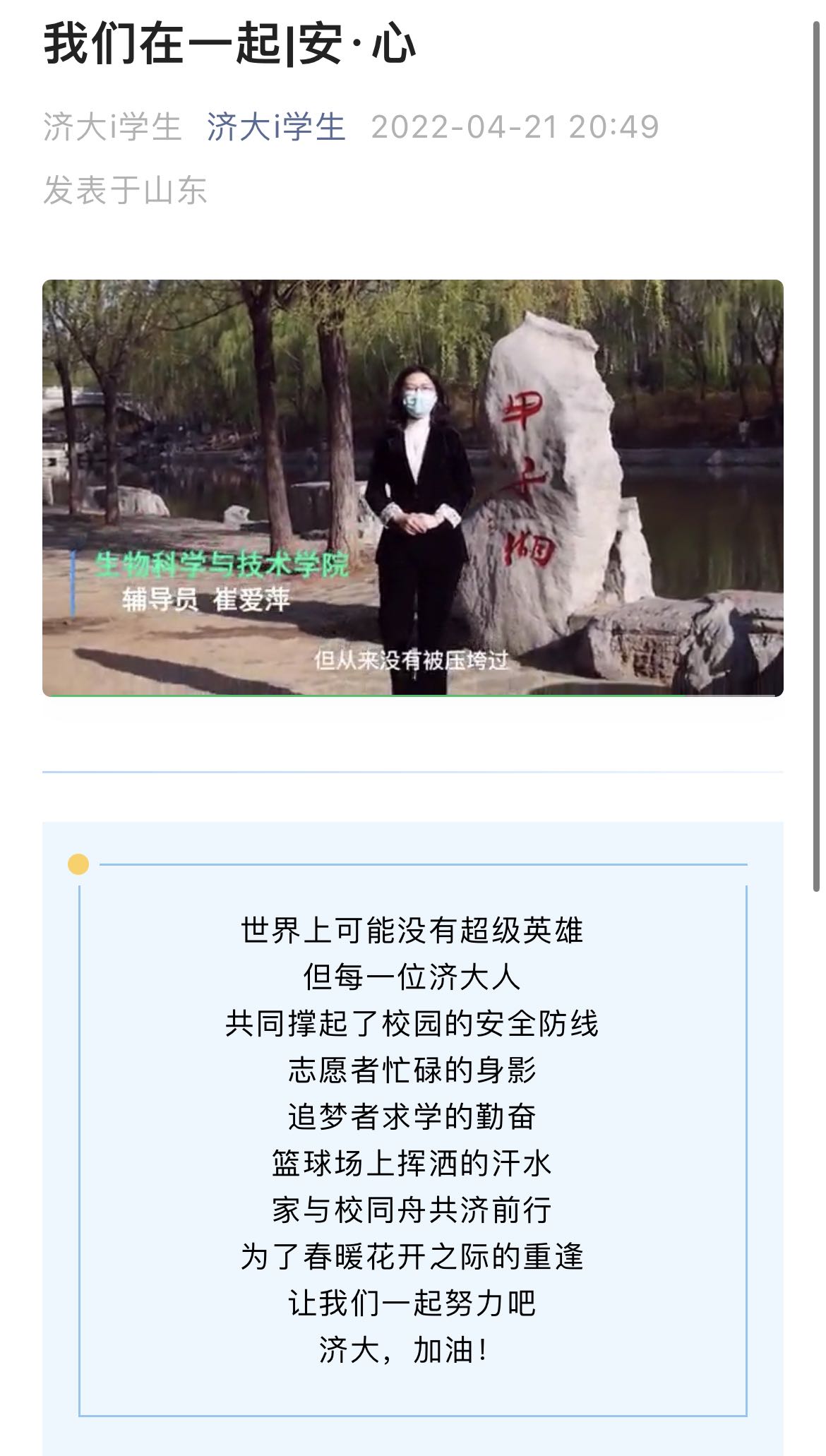 要闻、节气节日、同心防疫等。在“团徽闪耀”线上课堂,发布“回望百年辉煌路,“青”听团史忆初心”文章10篇,“回望百年辉煌路,青春作答知团情”学习资料10篇,帮助同学们学习团史,筑牢初心;邀请考研学子分享考研经验与感悟,策划“研途”看生科云端课堂,发布文章19篇;为帮助新生尽快适应大学生活和环境,开设“迎新特辑--新生指南”,发表文章5篇;开设“学习二十大,你问我来答”知识云课堂,更好的学习宣传贯彻党的二十大精神;策划录制“泉”心“城”意,同舟共“济”抗疫宣传片;征集并确定av解说
